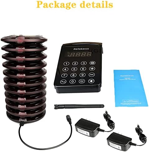 What are included in our package10X Retekess TD103 Coaster Pager1X Retekess TD103 Keypad transmitter1X Antenna1X Charge base2X Power adapter1X English operation manual