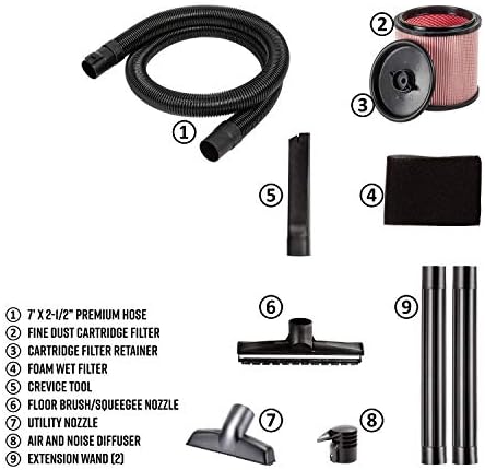 This Vacmaster Professional Beast Series 12-Gallon* 5.5 Peak HP† Wet/Dry Vac is a powerful high-performance vac designed to tackle the toughest cleanup projects—at the jobsite, around the shop, or in the garage.On-board hose, accessory, and power cord storage eliminates unneeded hassle and minimizes total storage space. A unique flat power head design allows you to conveniently store tools on top of the vacuum so they are easily accessible when needed. Over 27 ft. of cleaning reach (7’ hose and 20’ power cord) allows you to reach farther without unplugging the unit. Quickly control the power with the large dust sealed on/off switch. Heavy duty 360° swivel casters improve mobility on most surfaces. It also includes 9 accessories for nearly any task: 7 ft. x 2-1/2 in. kink resistant premium hose, utility nozzle, crevice tool, (2) extension wands, floor nozzle with squeegee & brush, fine dust cartridge filter, foam wet filter, and air & noise diffuser. Tank Size: 12 Gal., Tank Material: Polypropylene, Peak HP: 5.5, Voltage: 120V-60Hz, Amps: 10.5, Air Watts: 370, CFM: 143, Water Lift (In.): 60, Cord Length: 20 Ft., Hose Diameter: 7 Ft. x 2-1/2 In., Replacement Filters: VCFF, VCFS, VFF51, Dust Filter Bags: VDBL, VHBL, 7 Ft. x 2-1/2 In. Hose, 2 Extension Wands, Fine Dust Cartridge Filter, Foam Wet Filter, High Effiency Dust Bag, 14 In. Floor Nozzle, 8 In. Utility Nozzle, Air/Noise Diffuser.
