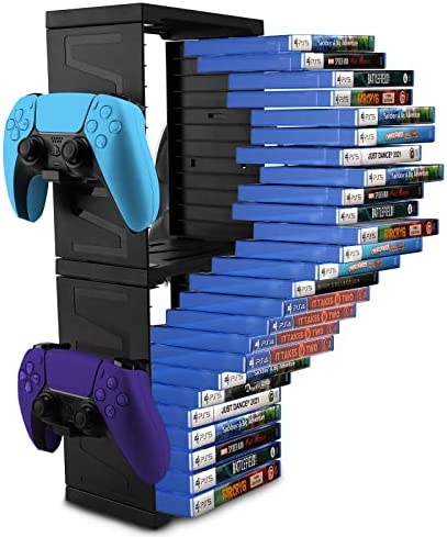 SIKEMAY Game Storage Tower for PS5/ PS4/ Xbox Series S & X/Xbox, Universal Video Games Discs Organizers 24 PCS with 4 Controllers Holder, Game Disk Box Stand Rack Accessories – Black