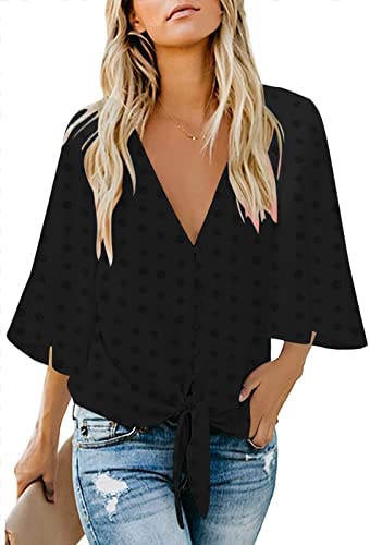 Feature: Sexy deep v neckline,3/4 ruffle sleeve, tie knot front tops for women, button down shirts, loose fit womens tops and blouses. Polka print and solid color blouse for summer,casual loose tops for women,juniors and teengirls.