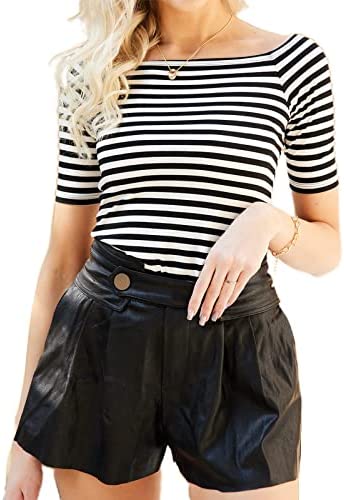 VOGUE STYLE: Short sleeve shirts for women with dressy boat neck, relaxed tight fitted top, sexy off shoulder design, vintage plain color and french striped retro style womens clothing.