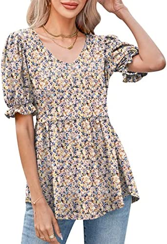 ❤【Feature】Puff short sleeve, v neck t shirts, pleated tunics, high low hem, casual flowy loose hem. Classic v-neck and puff sleeved design nicely flatters your sexy neckline and upper arms, providing a feminine, elegant and sweet touch. Elastic empire waist design allows to accentuate your slim waist but covers your tummy and hips without being too loose. Perfect babydoll tops for women.