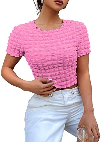 【Design】Ladies cute tees featrue solid,crew neck ,short sleeve, y2k, slim fit,popcorn textured fabrication with a stretchy give.can be worn with different items to show different fashion styles.