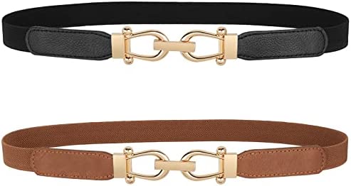 Women Skinny Elastic Belt for Dresses,Thin Retro Stretch Waist Belt with Golden Buckle 2 Pack