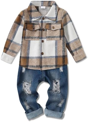 WESIDOM Toddler Baby Boy Clothes Long Sleeve Button Down Plaid Shirt + Denim Pants Set Boys Fall Winter Outfits 12M-5T
