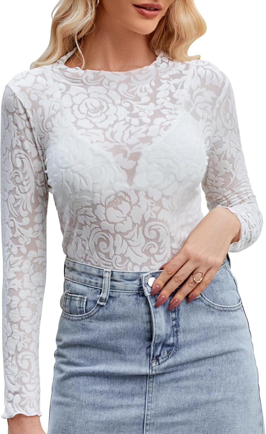 Floral Mesh Top for Women Mock Neck Long Sleeve Sheer Shirts Sheer Fitted Sexy Going Out Tops