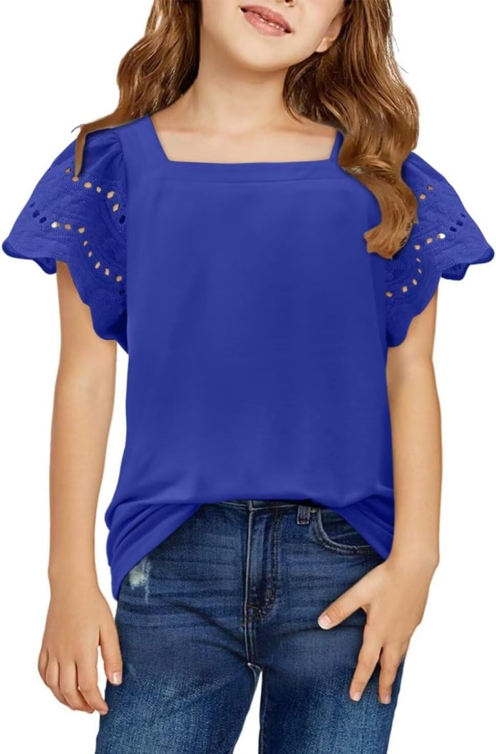 Cute shirts for girls, cold shoulder tops, classic solid color, decorated with ruffled short sleeve. Loose and casual, the flutter sleeve top makes your little princess looks lively and sweet.