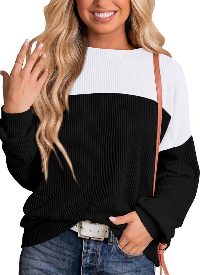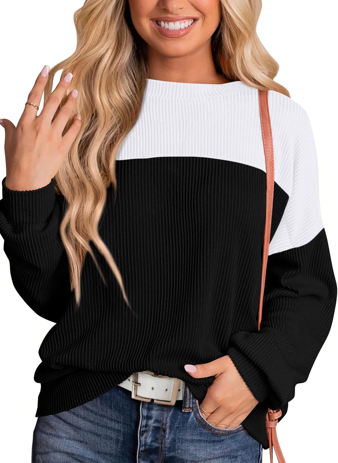 KIRUNDO Women 2025 Fall Color Block Loose Crewneck Lightweight Ribbed Knit Shirt