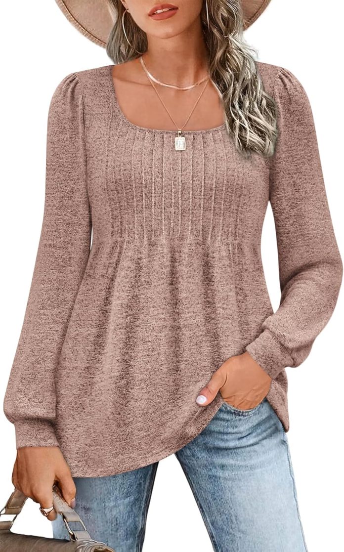 Womens Fashion Fall Tops Long Sleeve Pleated Square Neck Babydoll Peplum Tops