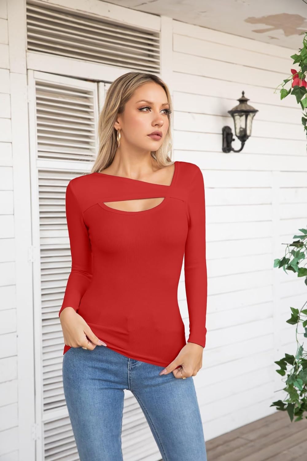 VICHYIE Women Cutout Neck Trendy Square Long Sleeve Ribbed Knit Shirts