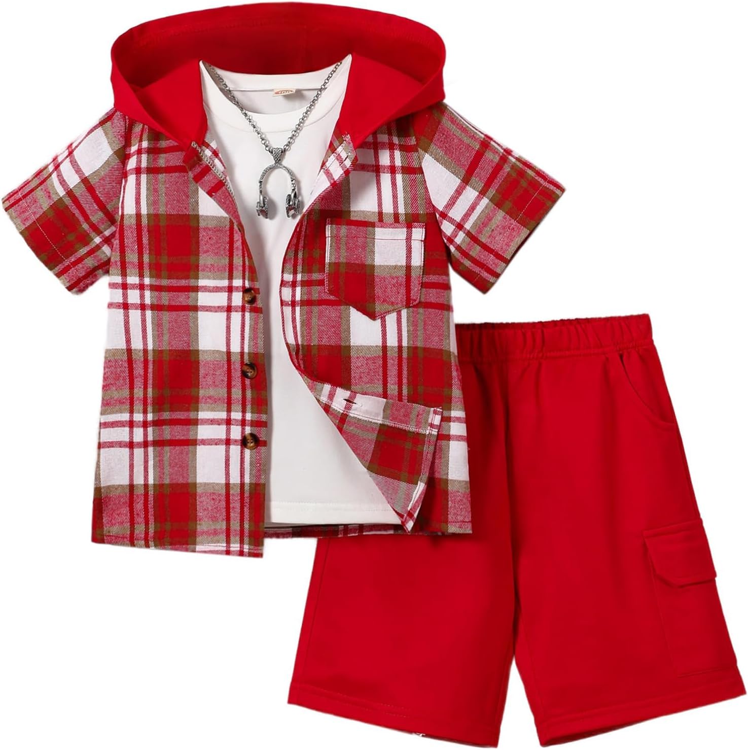 Boys Clothes Shorts Sets Plaid Short Sleeve Hooded Button Shirt and Jogger Shorts for Kids Summer Outfits