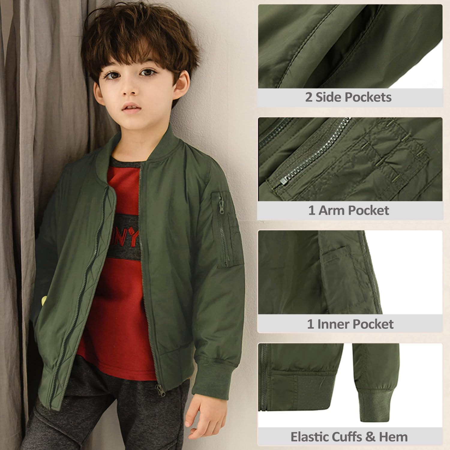 Premium Material Shell: 100% Nylon / Lining: 100% Polyester. Soft & Durable CUNYI kids bomber jacket is crafted from high-quality materials that are both durable and cozy, ensuring long-lasting wear. Windproof Design Our bomber jacket features a windproof design that shields them from gusts. Let your little one enjoy activities without any discomfort. Water Resistant The fabric is treated to repel water, keeping your child dry and comfortable even in light rainfall. 4 Convenient Pockets This winter jacket comes with 4 pockets, providing ample storage space for your child’s essentials, such as bus cards, keys or snacks. Multiple Occasions Our bomber jacket effortlessly combines style and functionality, making your kids look chic while being ready for casual outing, school day, or outdoor adventure. Easy Care Hand wash softly to prevent deformation. No bleach or dry clean.