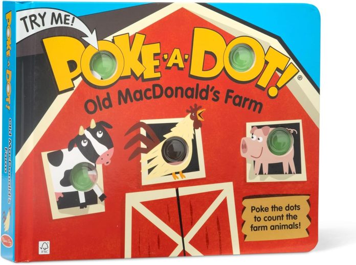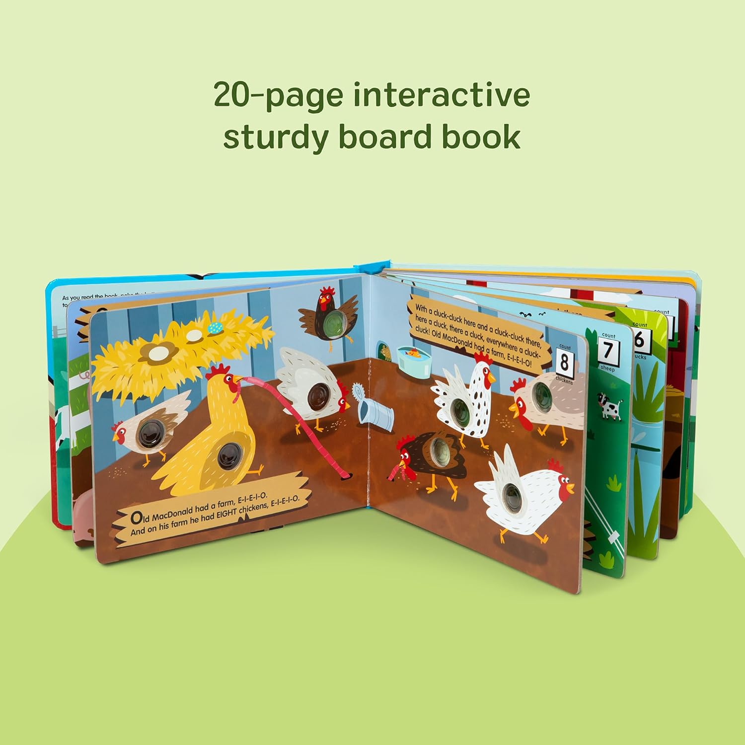 Sing, pop, and count along with Melissa & Doug Poke-a-Dot® Old MacDonald’s Farm, an interactive board book that brings a classic children’s song to life! This sturdy 20-page book features charming, farm-themed illustrations and built-in Patented Pop-a-Tronic™ buttons that make satisfying “click” and “pop” sounds when kids press them. With raised and flat pages, the buttons respond differently depending on how and where they’re pressed—front or back— keeping little hands engaged with multisensory fun. Designed with little learners in mind, the simple, easy-to-follow text keeps toddlers and preschoolers engaged with hands-on, screen-free fun—perfect for home, travel, or learning on the go. Kids can count animals, sing along, and build early skills like fine motor coordination and language development through interactive, screen-free play. Whether you’re shopping for a birthday, holiday, or milestone gift, this delightful sing along book is a barnyard hit with kids ages 3 and up. This product is certified by the Forest Stewardship Council. FSC certification ensures that products come from responsibly managed forests that provide environmental, social, and economic benefits, and that forests are protected for future generations. Please note that FSC certification applies to new inventory only (FSC C156584)
